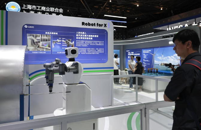 上海电气展台前,观众正在观看人形机器人进行清洁作业演示。新华社记者方喆 摄