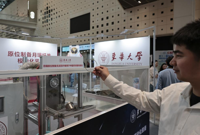 在上交会现场,东华大学先进纤维材料全国重点实验室带来了自主研发的“月壤原位制备玄武岩纤维模块化装备”,进行全球首展。展会期间,这一展台时常被围得里三层外三层。