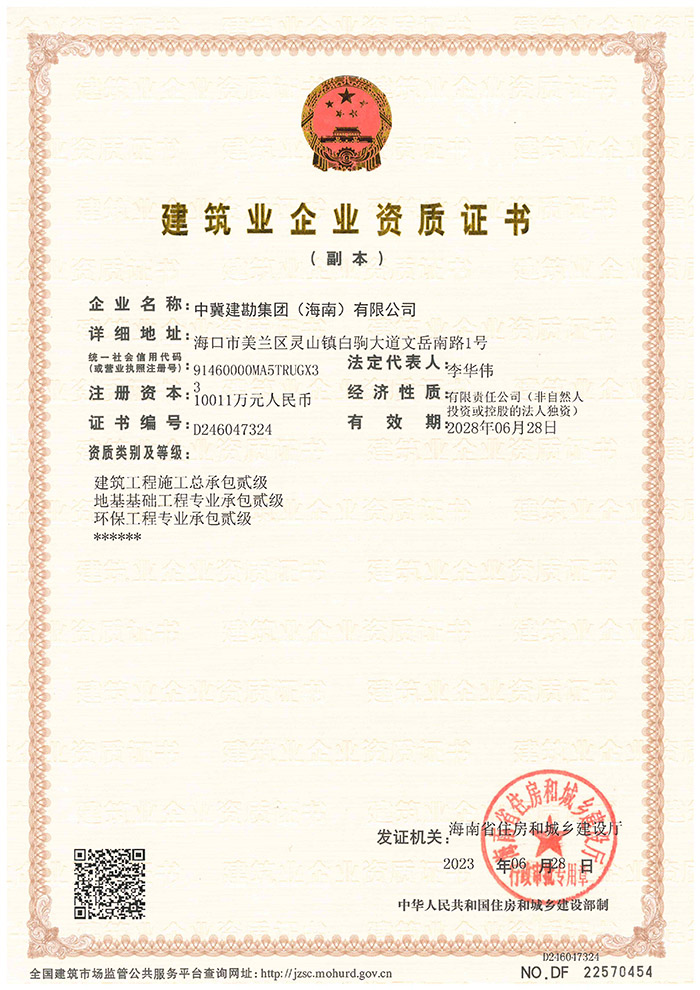 在集团公司领导的运筹帷幄下,2023年6月28日海南省住建厅通过了中冀建勘集团(海南)有限公司建筑业企业资质升级申请,顺利取得建筑工程施工总承包贰级、地基基础工程专业承包贰级和环保工程专业承包贰级资质。