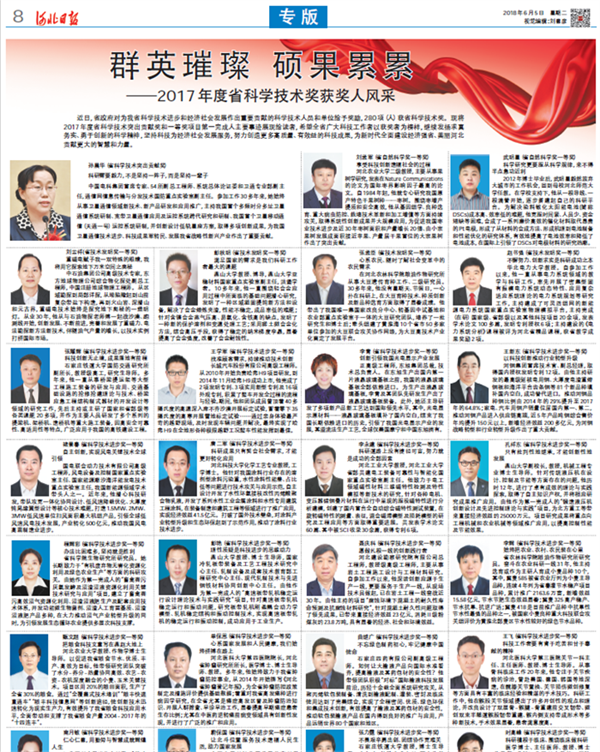 6月5日,河北日报专版文章《群英荟萃 硕果累累》对2017年度河北省科学技术奖获奖人风采进行展示。我公司的完成的《腐蚀环境下混凝土的耐久性寿命预测及抗腐蚀材料研究》获得一等奖,聂庆科总工程师作为第一完成人在专版文章中进行了刊载,这是以聂总为代表的广大专业技术人员的共同光荣,也必将激励我们更加努力争创新的科技成果和荣誉。
