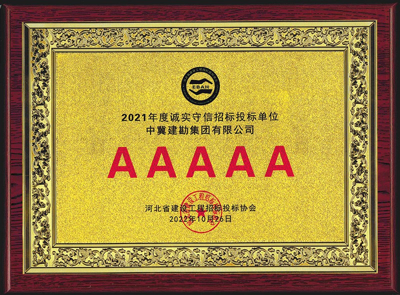 近日,我公司被河北省建设工程招标投标协会评为2021年度河北省建设工程招标投标诚实守信5A级施工企业。