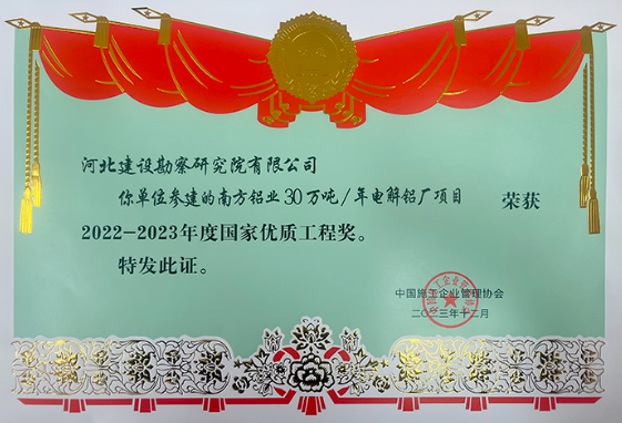 近日,根据国家优质工程奖评选办法,我公司参建的《南方铝业30万吨/年电解铝厂》项目,荣获2022-2023年度国家优质工程奖。